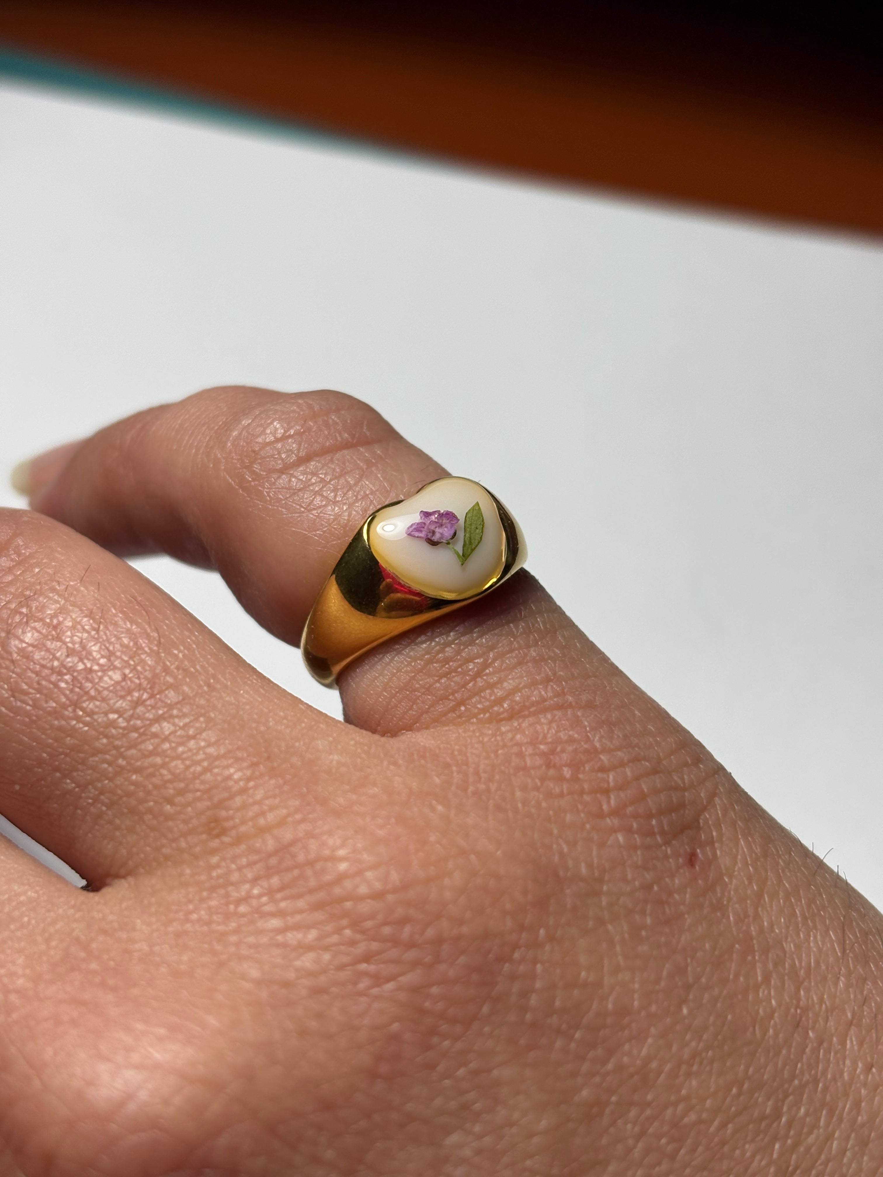 Dietro questi gioielli c’è il lavoro di una ragazza di 28 anni che da otto anni combatte con un mostro più grande di lei: l’ansia. Questa persona è un’assistente informatica, parla quattro lingue, ma il lavoro che fa non la soddisfa, non le dà pace. Lavorare con i fiori secchi e poterli inserire nella resina, rendendoli eterni, la fa sentire un po’ come se riuscisse a gestire anche la sua di fragilità e non solo quella dei fiori secchi. A te che hai comprato questo ciondolo, orecchino o anello che sia voglio dirti GRAZIE per aver dato un senso al mio tempo e soprattutto ricorda: l’artigianato è un mestiere che permette di dare una minima parte di sé, per questo spero che la custodirai in modo speciale. Con affetto “la persona”