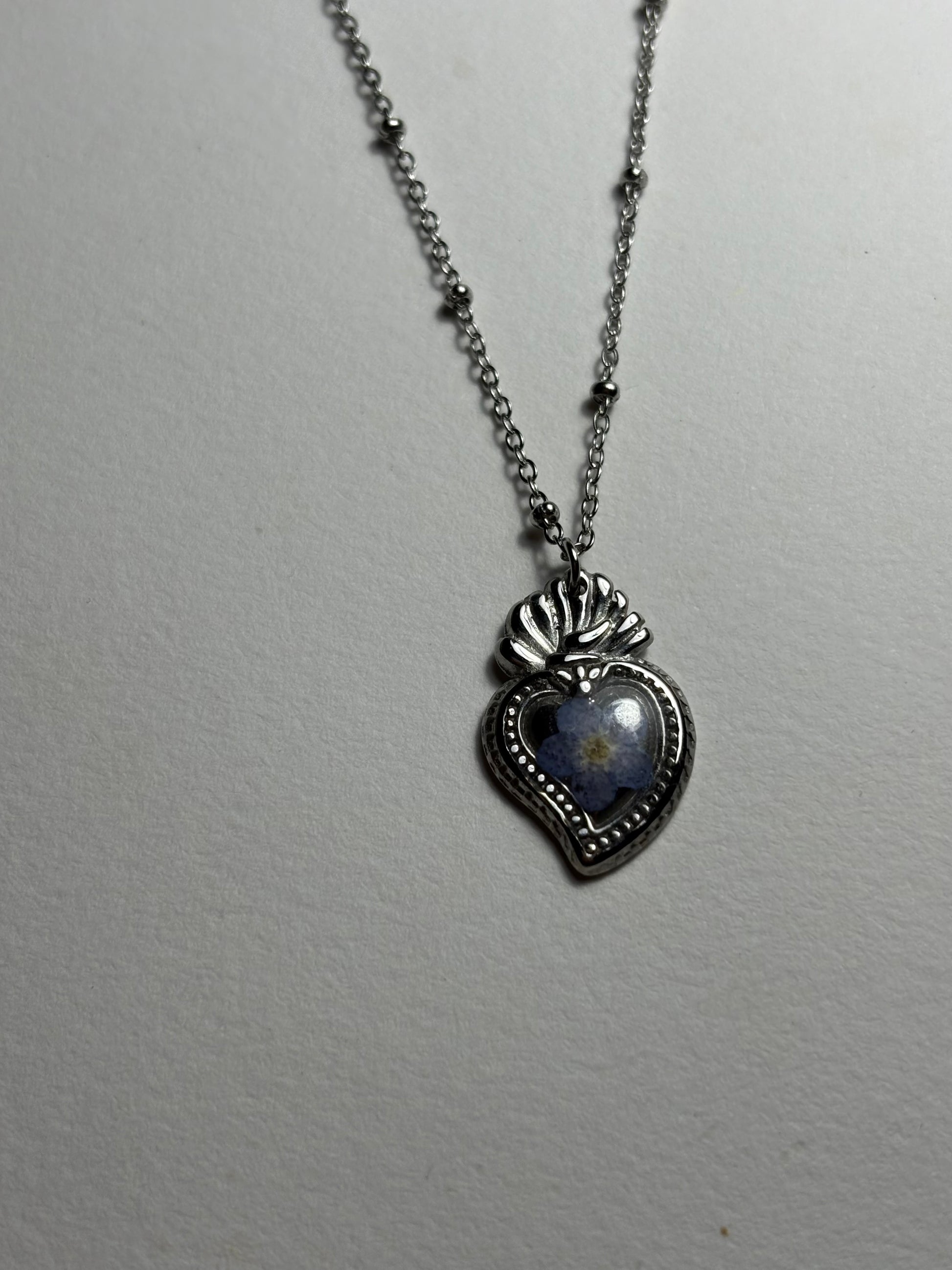 Collane in acciaio inossidabile, regolabile color argento con cuore sacro e bombatura in resina con fiore naturale non ti scordarti di me essiccato