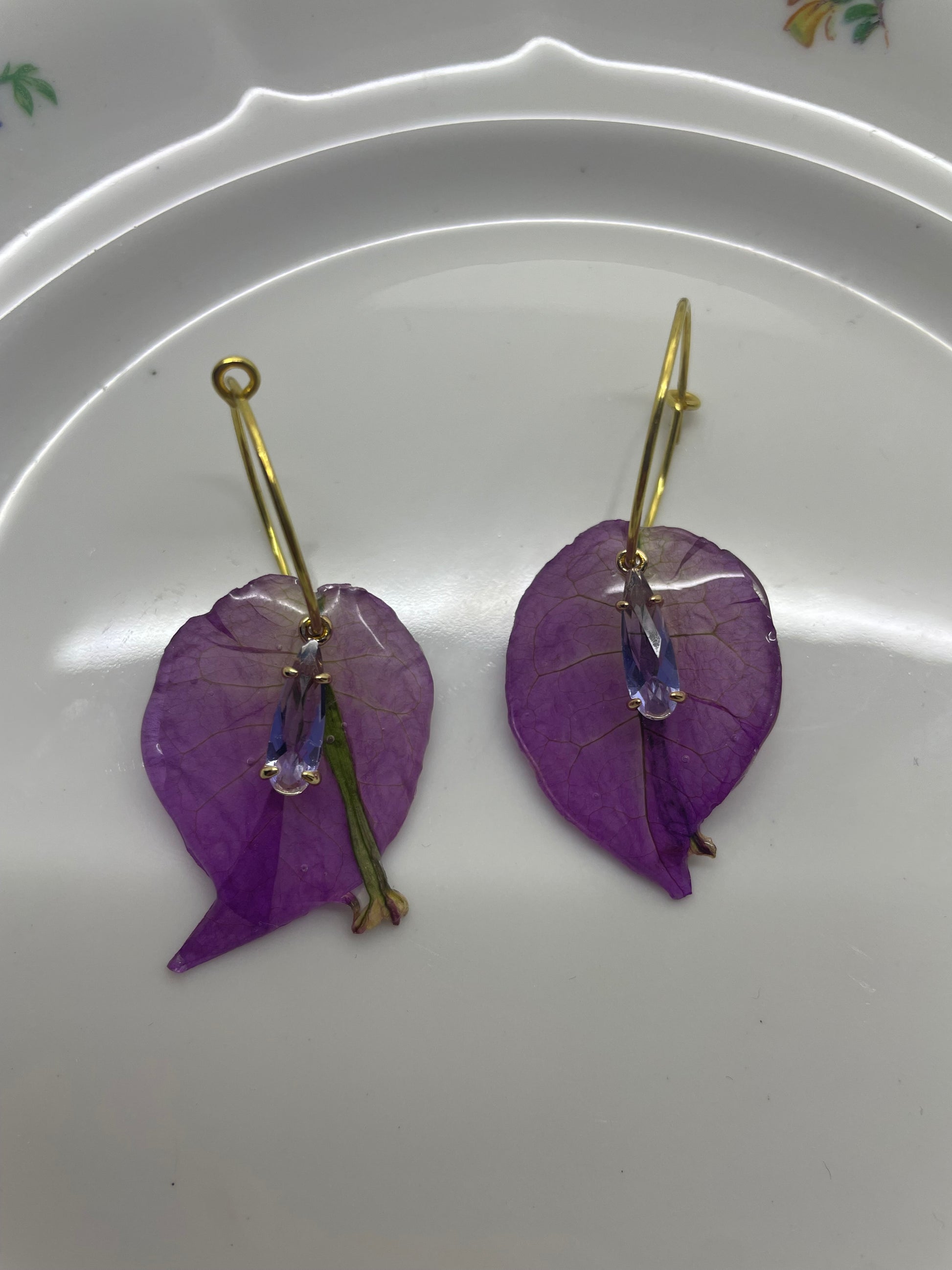 Orecchini in acciaio inossidabile con Boungainvillea naturale essiccato e charm in zircone lilla.