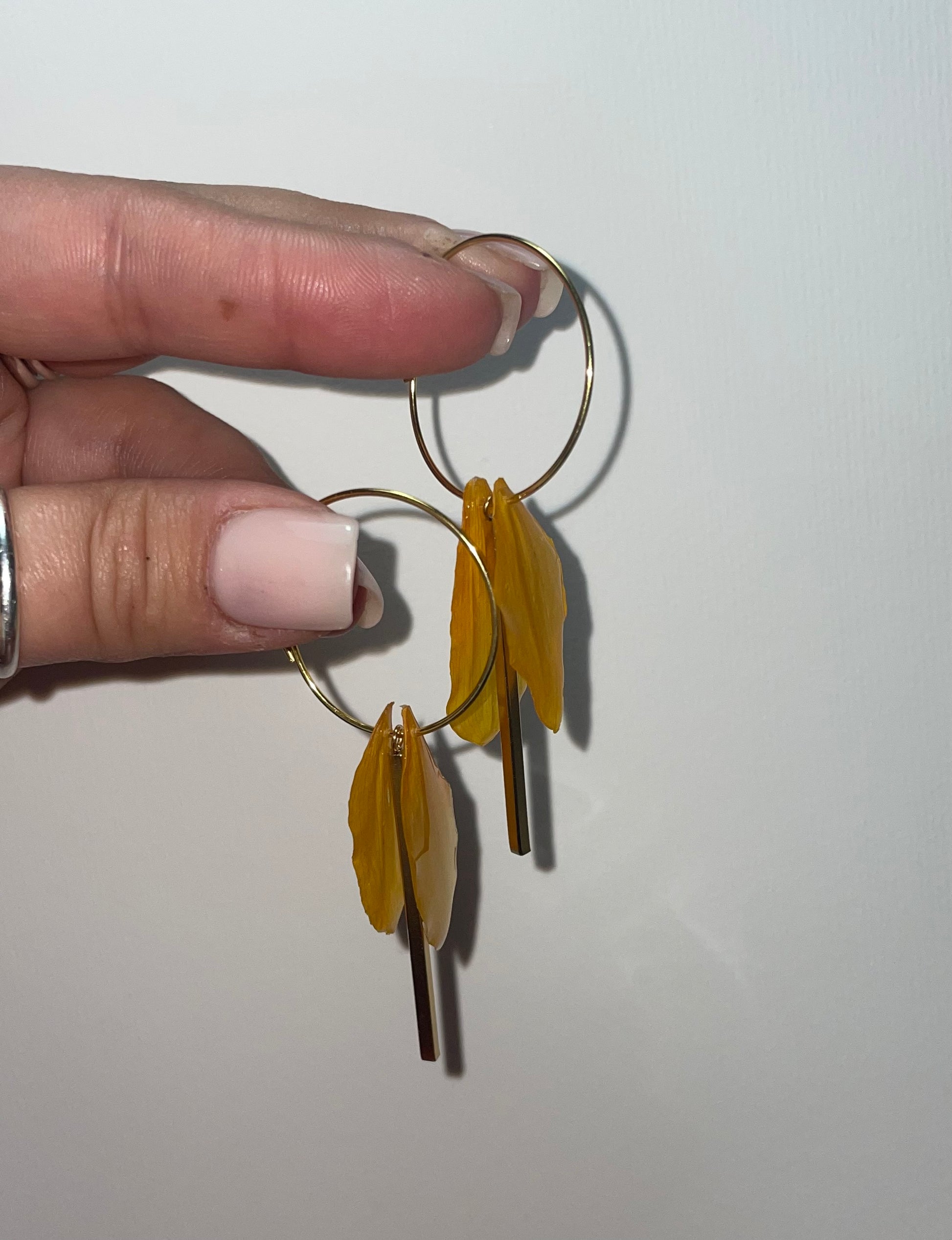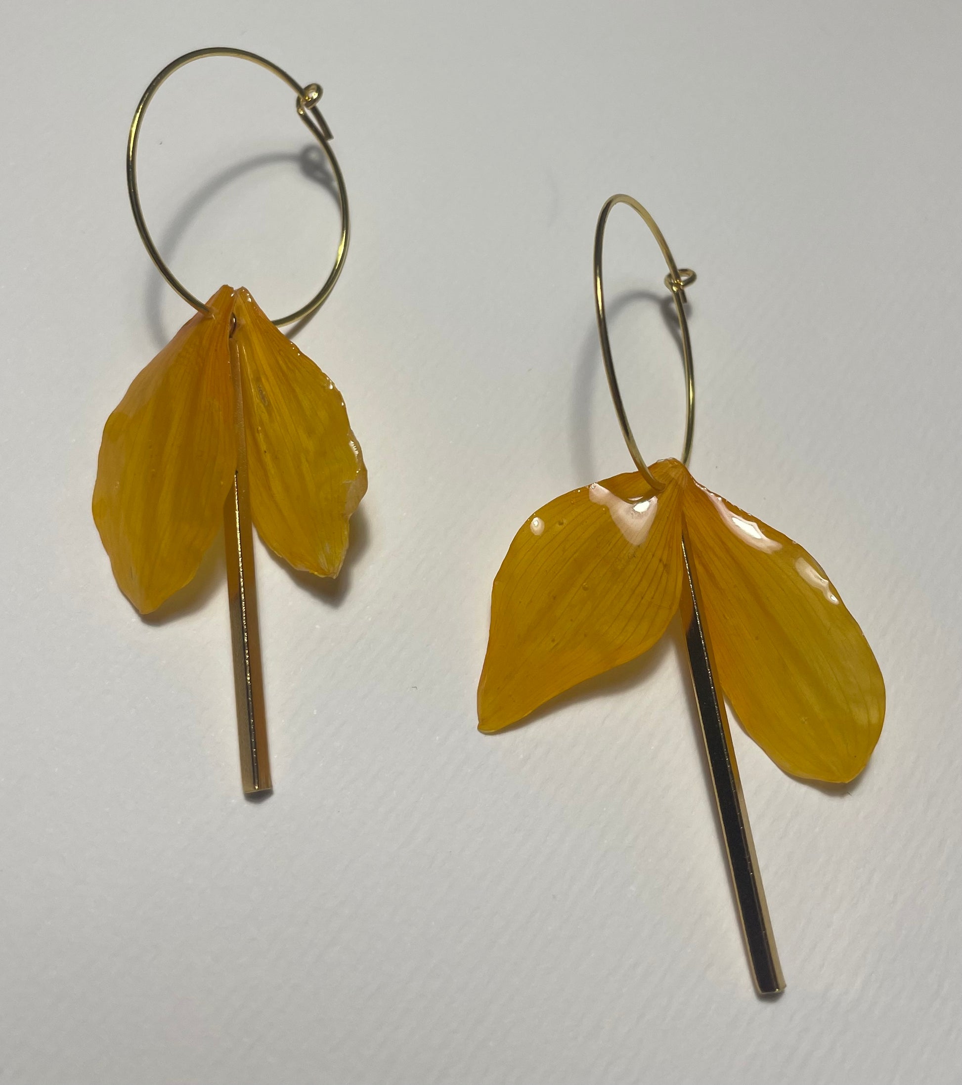 Orecchini in acciaio inossidabile con petali veri di Girasole e pendente in acciaio inossidabile. EDIZIONE LIMITATA.