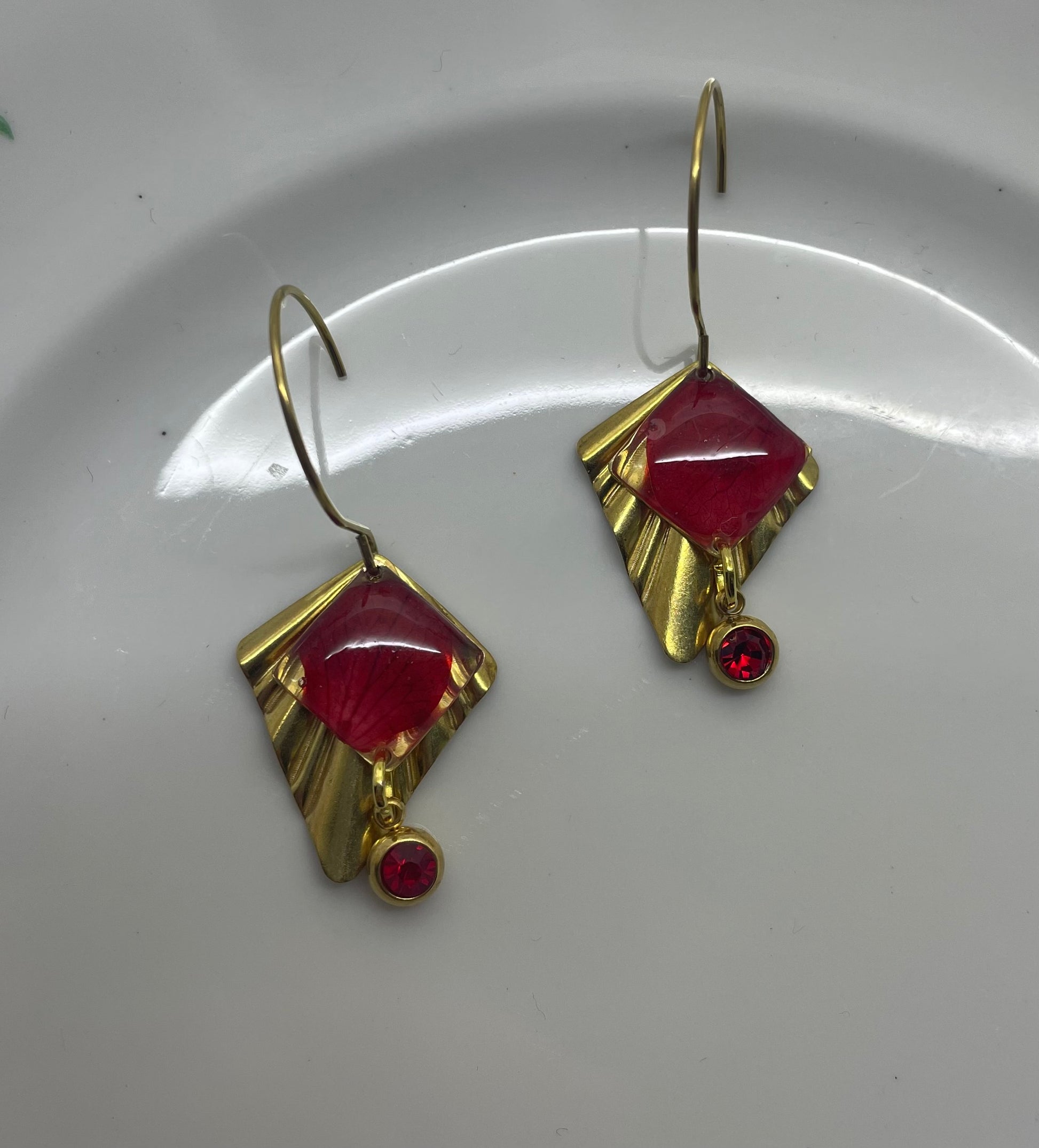 Orecchini in acciaio inossidabile con petalo di ortensia rossa naturale essiccata e charm in zircone rosso.