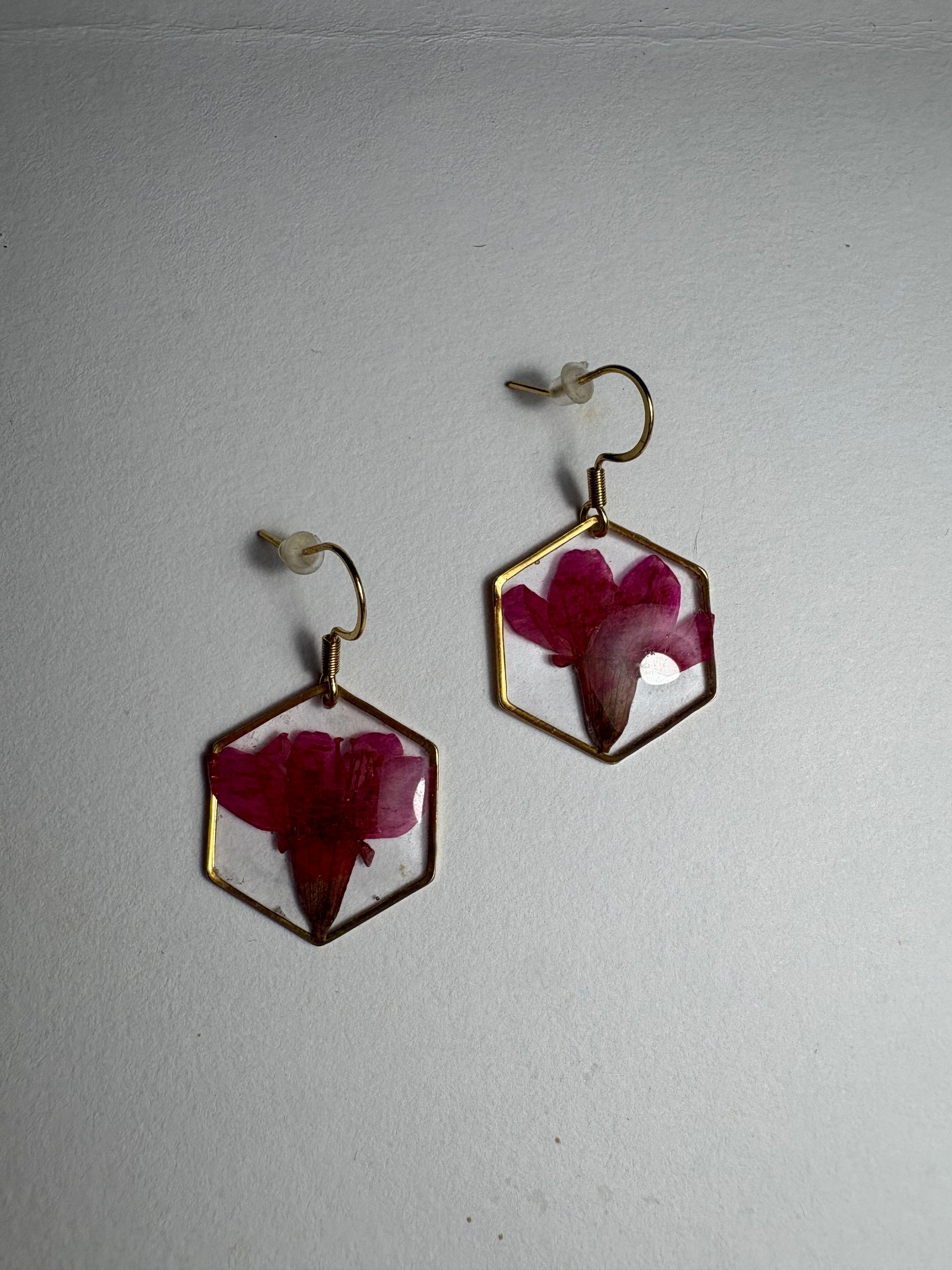 Orecchini in acciaio inossidabile in cornice esagonale con fior naturale di ciliegio essiccato, E catalizzato in resina