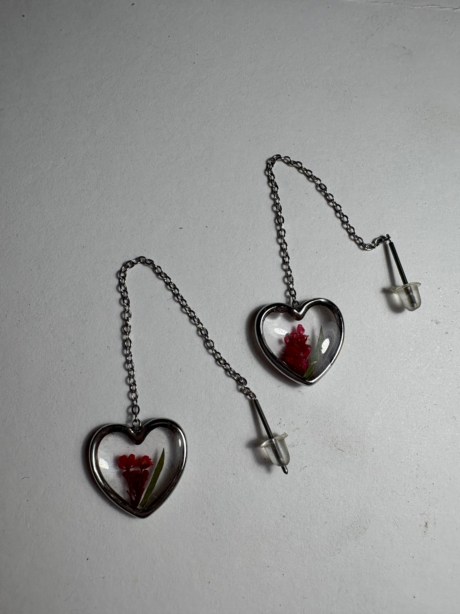 Orecchini in acciaio inossidabile, color argento, Modello saliscendi con fiori di campo Rossi essiccati e catalizzati in resina